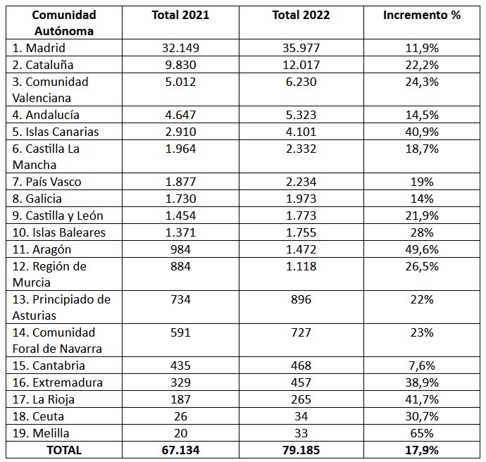 Por número de matriculaciones, el mayor aumento lo han experimentado las siguientes comunidades: Madrid, con 3.828 nuevas matriculaciones; Cataluña, con 2.187, la Comunidad Valenciana, con 1.218; y Canarias, con 1.191 nuevos vehículos.