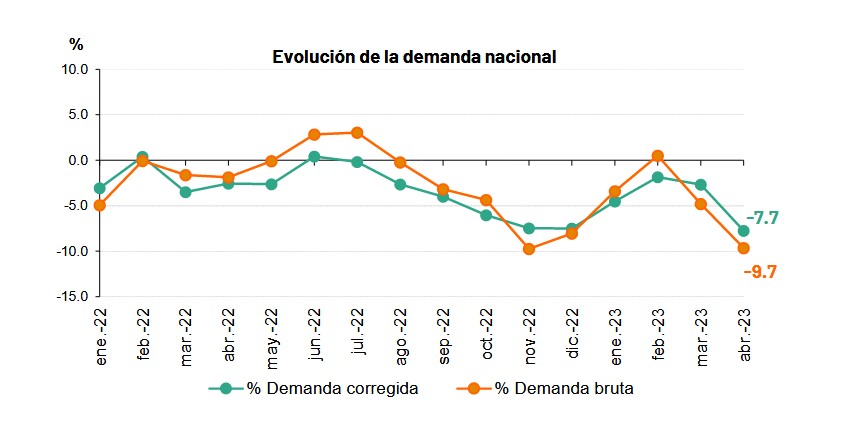La demanda eléctrica nacional experimentó en abril un descenso del 7,7% con respecto al mismo mes del año anterior, una vez descontados los efectos de temperatura y laboralidad. En términos brutos, se estima una demanda de 17.678 GWh, un 9,7% menos que la de abril de 2022.
