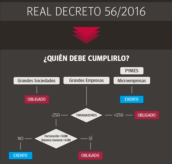 La auditoría energética es de aplicación para grandes empresas, consideradas aquellas que tengan más de 250 trabajadores y/o tengan un volumen de negocio que exceda de 50 millones de euros y un balance general que exceda de 43 millones de euros. De igual modo, será de aplicación a los grupos sociales establecido en el artículo 42 del Código de Comercio. Quedan excluidas las pymes y microempresas.