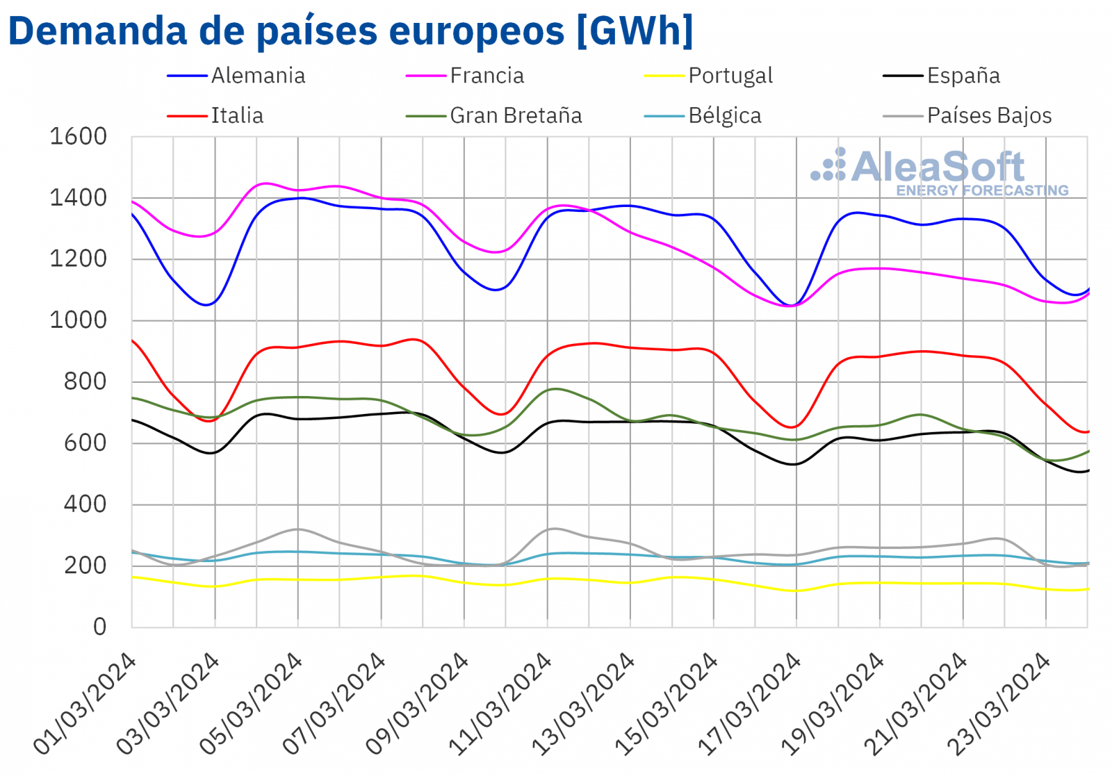 Para la semana del 25 de marzo, según las previsiones de demanda de AleaSoft Energy Forecasting, la tendencia a la baja continuará en Alemania, España, Italia y los Países Bajos. Por el contrario, la demanda aumentará en Francia, Portugal, Gran Bretaña y Bélgica.