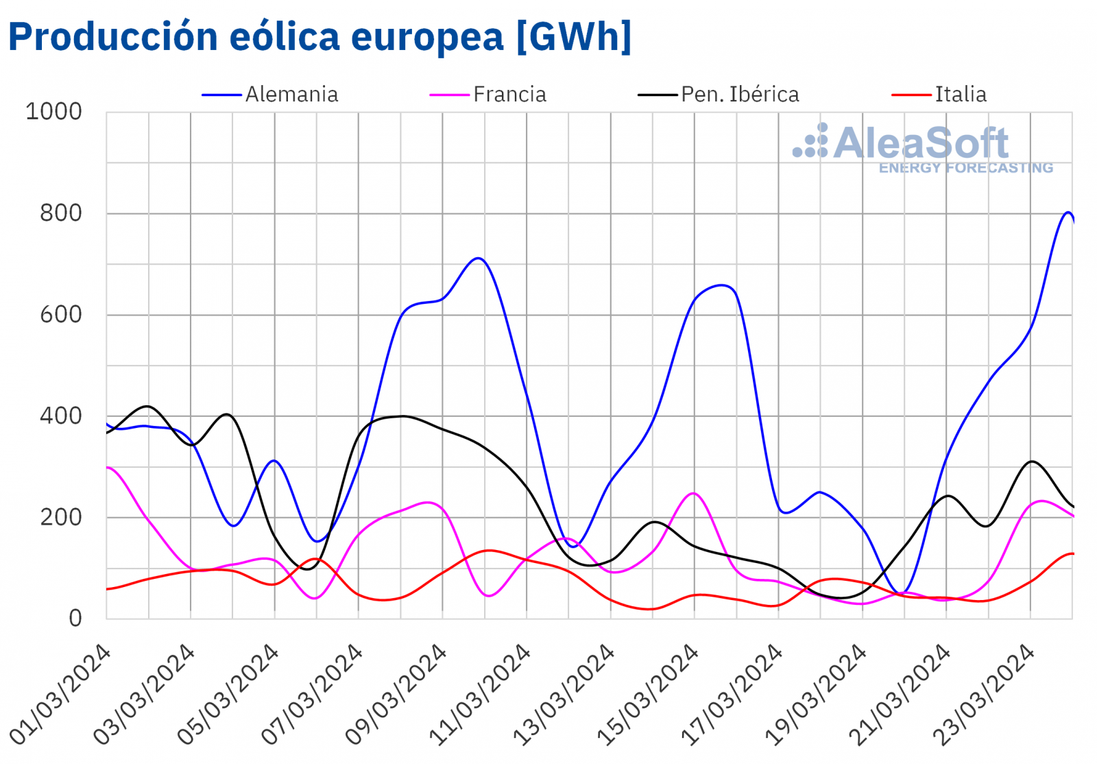 Durante la semana del 25 de marzo, según las previsiones de producción eólica de AleaSoft Energy Forecasting, la producción con esta tecnología continuará la tendencia ascendente con incrementos en España, Portugal, Italia y Francia. Sin embargo, se espera que en Alemania la producción eólica disminuya.