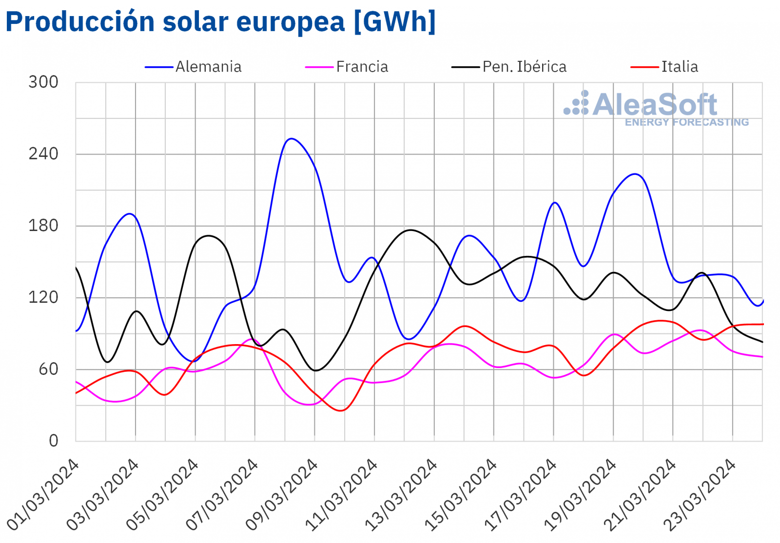 Para la semana del 25 de marzo, según las previsiones de producción solar de AleaSoft Energy Forecasting, la tendencia alcista continuará en el mercado alemán. En España e Italia se espera que la producción solar caiga.