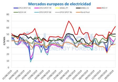 Los mercados EPEX SPOT de Alemania, Francia, Bélgica y Países Bajos también han experimentado un aumento en sus precios en lo que va de semana respecto al mismo período de la semana anterior. El mercado de Alemania ha sido el de menor crecimiento, de un 4,7% respecto al mismo período de la semana pasada, cerrando con un promedio de 40,32 €/MWh para los cuatro primeros días de la presente semana, comprendidos entre el lunes 16 de septiembre y el jueves 19 de septiembre. Del grupo de países analizados correspondientes al mercado de EPEX SPOT, Francia ha sido el de mayor aumento, con un incremento del 16% y un precio medio de 42,91 €/MWh, seguido por Bélgica y Países Bajos, que han tendido aumentos del 12% y 6,2%, con precios de 41,40 €/MWh y 40,64 €/MWh, respectivamente. El mercado IPEX de Italia ha aumentado en lo que va de semana un 16% y continúa siendo el de mayor precio de los mercados analizados, con 55,92 €/MWh de promedio. El mercado británico N2EX, que ha aumentado en un 17%, ha cerrado con el tercer precio más alto en lo que va de semana, de 47,98 €/MWh. En cambio, el precio del mercado Nord Pool ha sido el único que ha promediado a la baja respecto a la semana pasada, disminuyendo en un -1,2% y siendo el precio de 33,28 €/MWh el más bajo de todos los mercados europeos analizados.