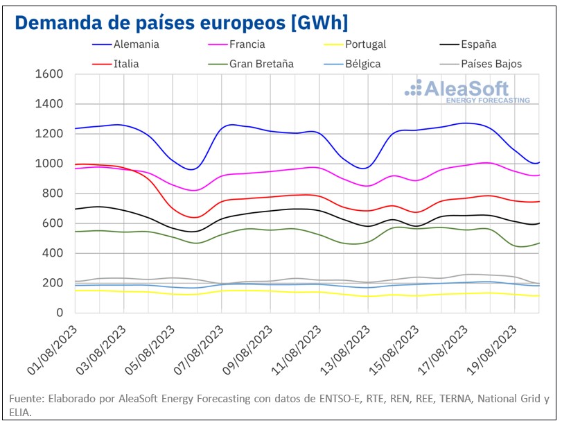 Durante este período, las temperaturas medias en la mayoría de los países europeos analizados aumentaron con respecto a la semana anterior. Los incrementos de las temperaturas oscilaron entre los 0,8°C registrados en Gran Bretaña y los 4,8°C registrados en Alemania, los cuales influyeron en el incremento de la demanda en estos mercados. Las excepciones fueron España y Portugal con descensos en las temperaturas medias de 0,4°C y 0,8°C, respectivamente, que en conjunto con la disminución de la laboralidad por el festivo del martes 15 de agosto, Asunción de la Virgen, favorecieron el descenso de la demanda durante la semana.