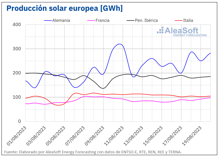 Para la semana del 21 de agosto, según las previsiones de producción solar de AleaSoft Energy Forecasting, se espera que disminuya en los mercados Alemania e Italia, mientras que en España se prevé que aumente.