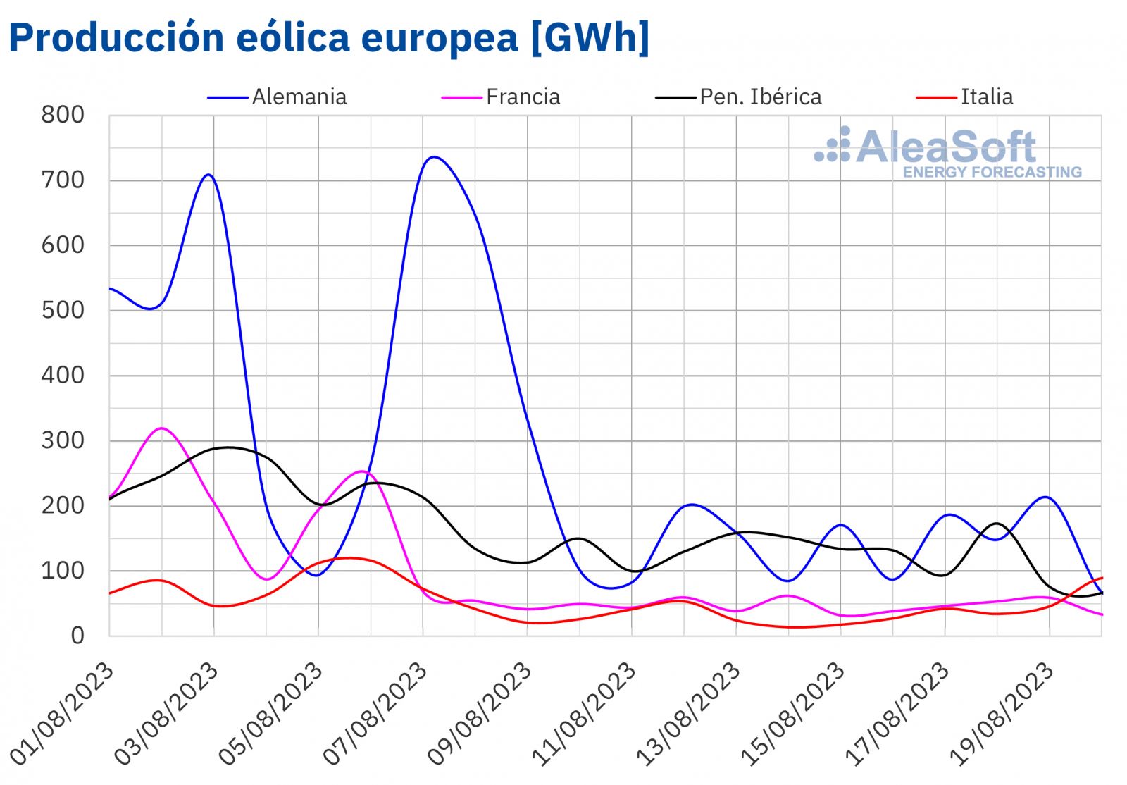 En la tercera semana de agosto, en comparación con la semana anterior, la producción eólica descendió en todos los mercados analizados. La mayor bajada, del 57%, se registró en el mercado alemán. En el resto de los mercados la caída de la producción estuvo entre el 3,7% del mercado italiano y el 18% del mercado español.