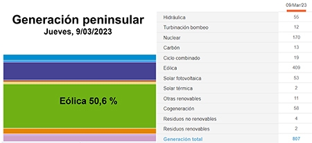 La energía eólica ha generado un 50,6% en la península el 9 de marzo, llegando a superar la producción de 21.000 MWh en tramos horarios de la tarde, récord absoluto de generación eléctrica.