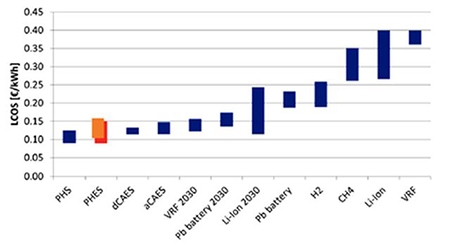 Entre los principales resultados de este trabajo destaca el desarrollo conceptual de la idea, en la que se estiman rendimiento y coste de almacenamiento de la energía o LCOS (Levlized Cost of Storage). El análisis realizado aporta LCOS de 0,12 €/kWh y 80% de rendimiento. Es interesante comparar el coste con otras tecnologías en la figura 1. Podemos observar que este valor sitúa al PTES analizado como una de las tecnologías más rentables, ya que posee los mejores valores para PHS (hidroelectricidad de almacenamiento por bombeo) y PHES (almacenamiento eléctrico de calor por bombeo), aunque para ambas el coste inicial es mayor y las condiciones geográficas muy exigentes.
