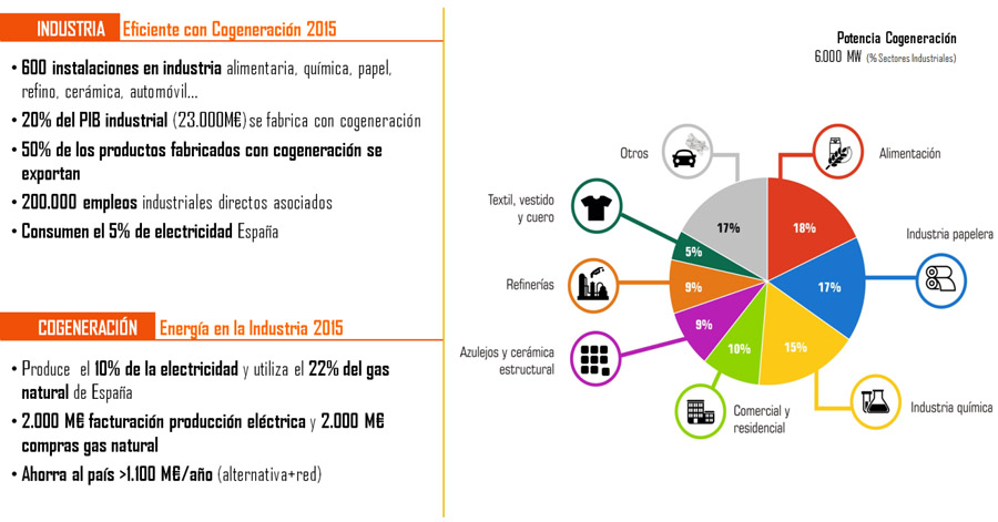 Pese a las cientos de plantas que han parado en el trienio de la reforma energética, la cogeneración sigue produciendo con alta eficiencia el 10% de la electricidad española, atendiendo las necesidades de energía térmica en más de 600 industrias, ahorrando en energía más de 1,6 millones de toneladas equivalentes de petróleo y siendo clave para el sector gasista porque supone el 22% de todo el consumo nacional de gas natural, 40% de lo consumido por la industria.