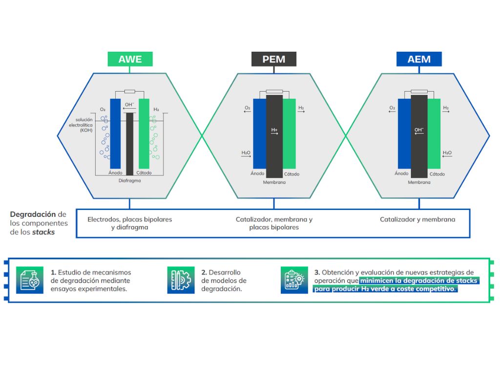 El consorcio ha identificado cuatro parámetros clave que influyen directamente en la degradación de los stacks: altas densidades de corriente, arranques y paradas frecuentes, fluctuaciones de carga y pendientes de carga. Durante el proyecto, se definirán protocolos experimentales para medir cómo afectan estos parámetros al rendimiento del electrolizador en estado estacionario, dinámico y en ciclos ON/OFF.