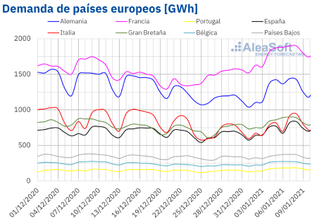 Para la semana del 11 de enero, las previsiones de demanda de AleaSoft esperan ascensos en los mercados de Alemania, España e Italia y descensos en el resto de mercados.