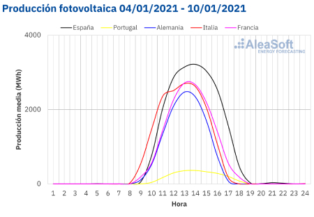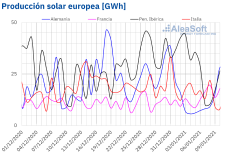 La producción solar entre el lunes 4 y el domingo 10 de enero, disminuyó en la mayoría de los mercados analizados en AleaSoft en comparación con la semana precedente. En el mercado alemán la producción solar disminuyó un 50% mientras que en el mercado italiano y en la península ibérica la reducción de la producción fue de un 20% y 37% respectivamente. La excepción fue el mercado francés en el que se registró un aumento del 23% en la producción con esta tecnología.