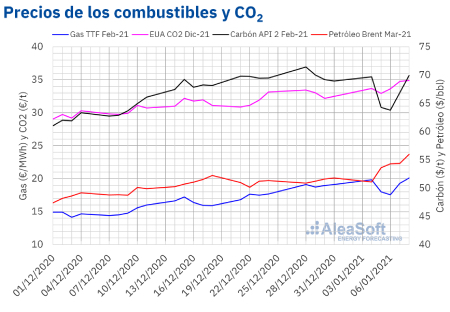 Los futuros de petróleo Brent para el mes de marzo de 2021 en el mercado ICE iniciaron el año 2021 registrando el lunes 4 de enero un precio de cierre un 1,4% inferior al de la última sesión de 2020. Sin embargo, durante el resto de la semana los precios aumentaron y el viernes 8 de enero se alcanzó un precio de cierre de 55,99 $/bbl. Este precio fue el más elevado desde febrero de 2020.
