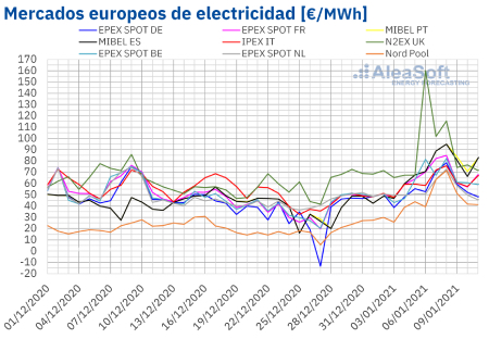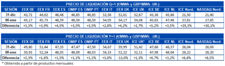 Por otra parte, la primera semana del año se alcanzaron precios horarios superiores a 100 €/MWh en todos los mercados eléctricos analizados. En el mercado Nord Pool, el precio de la hora 11 del viernes 8 de enero, de 101,77 €/MWh, fue el más alto desde principios de marzo de 2018. En el caso de España y Portugal, el sábado 9 de enero, en la hora 21, se alcanzó un precio horario de 121,24 €/MWh. Este precio fue el más elevado desde diciembre de 2010 en España y desde enero de 2010 en Portugal. Pero el precio horario más elevado de la semana se alcanzó en el mercado N2EX de Gran Bretaña, cuando en la hora 19 del día 6 de enero se alcanzaron los 1000,04 £/MWh, el valor más alto de al menos los últimos 11 años en este mercado.