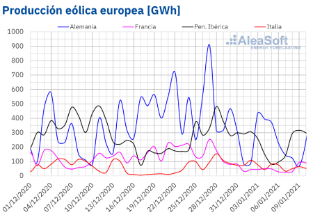 Durante la primera semana de 2021, la producción eólica disminuyó en todos los mercados analizados en AleaSoft en comparación con la última semana de 2020. El mercado más afectado fue el español en el que la producción con esta tecnología se redujo un 45%. En el mercado italiano la reducción estuvo cercana al 41% mientras que en el francés fue del 35%. También sufrieron caídas importantes los mercados de Alemania y Portugal, con una reducción de sus producciones de un 22% y un 13% respectivamente.