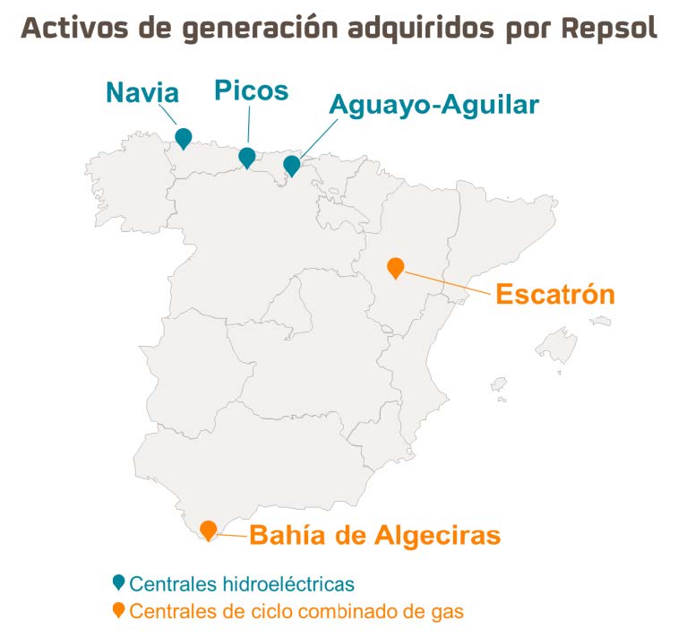 Repsol adquirirá la mayoría de los activos no regulados de Viesgo, como el negocio de comercialización, que cuenta con contratos de electricidad y gas con 750.000 hogares y empresas, así como 700 MW de generación de energía hidráulica convencional (tanto centrales de bombeo como de agua fluyente), y dos plantas con turbinas de gas de ciclo combinado (CCGT) con una capacidad instalada total de 1.650 MW, en concreto, los ciclos ubicados en Escatrón, Zaragoza, de 818 MW y Algeciras, de 830MW.