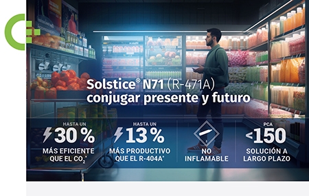 Distribuido por Climalife y fabricado por Honeywell, la nueva mezcla de HFO Solstice® N71 (R-471A) ofrece numerosas ventajas para ayudar a cadenas de supermercados y gestores de tiendas a reducir su huella de carbono. Esta innovación es una verdadera palanca para impulsar su transición con una tecnología fiable y segura, probada durante años.