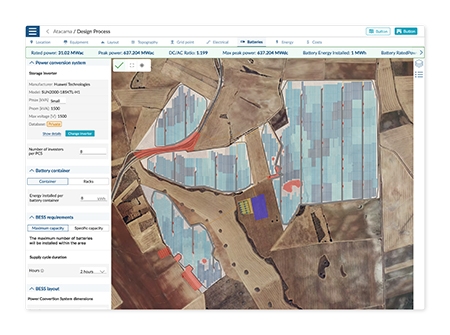 pvDesign localiza automáticamente los contenedores de baterías y los centros de transformación en el emplazamiento definido. Tendrá en cuenta las horas de suministro de las baterías, calculará la longitud de los cables y realizará movimientos de tierra. También dimensionará la instalación de interconexión.