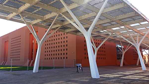 La española Onyx Solar ha completado su primer proyecto en Marruecos con la instalación de una pérgola fotovoltaica de casi 600m2 a la entrada de la Universidad Politécnica Mohamed VI, dotando de este modo al complejo de un espacio por el que los usuarios pueden caminar entre edificios y disfrutar de una agradable y refrescante sombra, necesaria en lugares como Marruecos, donde se alcanzan temperaturas altas y se está expuesto a la radiación solar. Esta pérgola es una innovadora forma de sustituir las celosías que tradicionalmente se han utilizado en la construcción árabe para generar sombras entre edificios.