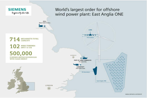 Siemens ha recibido un importante pedido para su división de energía eólica marina: la empresa suministrará, instalará y pondrá en marcha 102 aerogeneradores, cada uno con una capacidad de siete megavatios y un diámetro de rotor de 154 metros para el proyecto East Anglia ONE. El cliente es ScottishPower Renewables, filial de Iberdrola España. El parque eólico de 714 megavatios, en términos de capacidad, será el proyecto más grande de Siemens hasta ahora.
