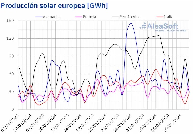Durante la semana del 5 de febrero, la producción solar disminuyó en todos los principales mercados eléctricos europeos, a pesar de que las horas de sol van en aumento, invirtiendose la tendencia alcista de las semanas anteriores. Las reducciones variaron entre el 44% en Portugal y el 17% en Francia.