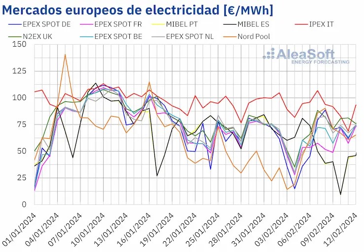 Durante la semana del 5 de febrero, la caída de la producción solar ejerció su influencia al alza sobre los precios del mercado alemán. En mercados como el británico y el neerlandés el incremento de la demanda también contribuyó al aumento de los precios. Sin embargo, el importante incremento de la producción eólica en los mercados francés, ibérico e italiano propició que los precios bajasen en estos mercados.